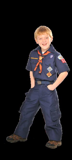 To the left is a Tiger Scout dressed in his formal (Class A) uniform. Parents pay for the uniform shirt (Council Patch, BSA Fleur de Lis and Pack Numbers), pants, belt and hat. This is how all Tigers should be dressed for all official scout events (Pack Meeting, Council Activities etc...) As part of the Pack Fee your son will receive all of the following Tiger related items: Neckerchief, Slide, Rank Patches, Belt Loops and Pins, (most) Event Patches and book. Wearing the Class A uniform may not always be practical for all activities, for these occasions your scout will wear an informal (Class B) uniform. This consists of a pack provided t-shirt to be worn with personal clothing that is event appropriate and his hat.